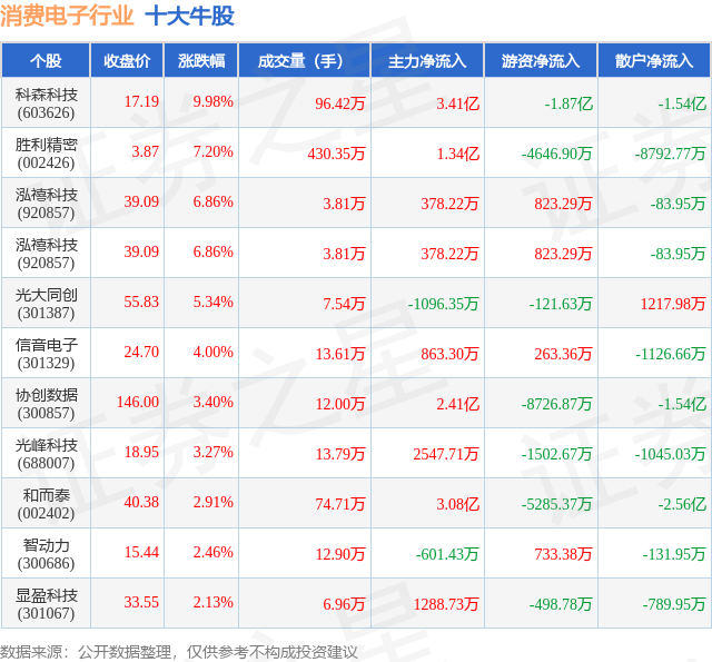 个股表现方面,消费电子行业当日领涨股为科森科技(603626),该股当日报收17.19,上涨9.98%,成交量96.42万,主力资金净流入3.41亿元。胜利精密(002426)以上涨7.2%紧随其后,该股当日成交量430.35万,主力资金净流入1.34亿元。除此之外,泓禧科技(920857)、泓禧科技(920857)、光大同创(301387)均进入当日牛股之列。具体个股列表见下表: