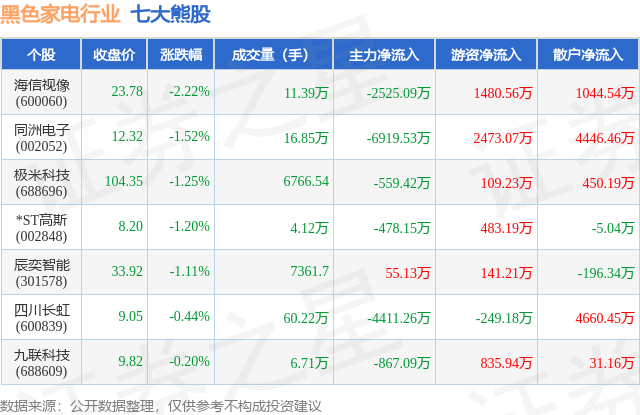 个股表现方面,黑色家电行业当日领跌股为海信视像(600060),该股当日报收23.78,下跌2.22%,成交量11.39万,主力资金净流出2525.09万元。同洲电子(002052)以下跌1.52%紧随其后,该股当日成交量16.85万,主力资金净流出6919.53万元。除此之外,极米科技(688696)、*ST高斯(002848)、辰奕智能(301578)均进入当日熊股之列。具体个股列表见下表: