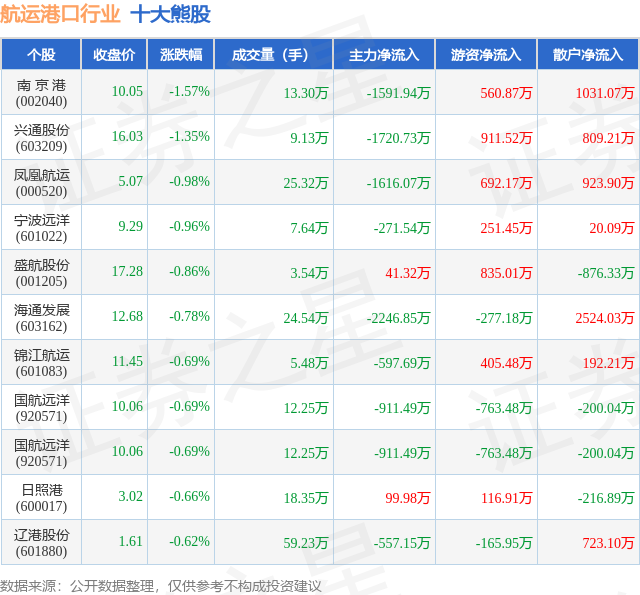 个股表现方面,航运港口行业当日领跌股为南 京 港(002040),该股当日报收10.05,下跌1.57%,成交量13.3万,主力资金净流出1591.94万元。兴通股份(603209)以下跌1.35%紧随其后,该股当日成交量9.13万,主力资金净流出1720.73万元。除此之外,凤凰航运(000520)、宁波远洋(601022)、盛航股份(001205)均进入当日熊股之列。具体个股列表见下表: