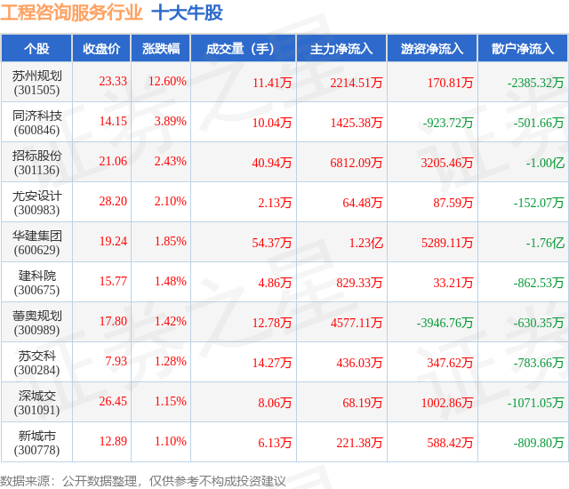 个股表现方面,工程咨询服务行业当日领涨股为苏州规划(301505),该股当日报收23.33,上涨12.6%,成交量11.41万,主力资金净流入2214.51万元。同济科技(600846)以上涨3.89%紧随其后,该股当日成交量10.04万,主力资金净流入1425.38万元。除此之外,招标股份(301136)、尤安设计(300983)、华建集团(600629)均进入当日牛股之列。具体个股列表见下表:
