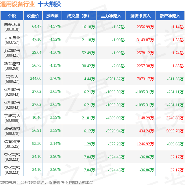 个股表现方面,通用设备行业当日领跌股为申菱环境(301018),该股当日报收64.47,下跌4.57%,成交量16.18万,主力资金净流出1.37亿元。大元泵业(603757)以下跌4.52%紧随其后,该股当日成交量21.18万,主力资金净流出1.9亿元。除此之外,力星股份(300421)、新莱应材(300260)、精智达(688627)均进入当日熊股之列。具体个股列表见下表: