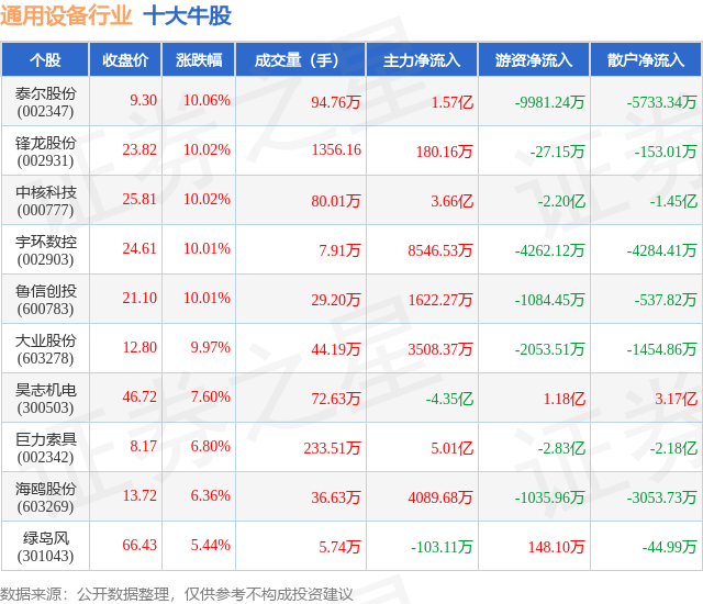 个股表现方面,通用设备行业当日领涨股为泰尔股份(002347),该股当日报收9.3,上涨10.06%,成交量94.76万,主力资金净流入1.57亿元。锋龙股份(002931)以上涨10.02%紧随其后,该股当日成交量1356.0,主力资金净流入180.16万元。除此之外,中核科技(000777)、宇环数控(002903)、鲁信创投(600783)均进入当日牛股之列。具体个股列表见下表: