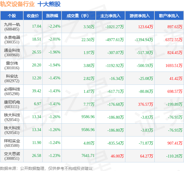 个股表现方面,轨交设备行业当日领跌股为九州一轨(688485),该股当日报收17.04,下跌2.24%,成交量3.5万,主力资金净流出1021.27万元。永贵电器(300351)以下跌2.01%紧随其后,该股当日成交量22.5万,主力资金净流出4977.61万元。除此之外,通业科技(300960)、雷尔伟(301016)、科安达(002972)均进入当日熊股之列。具体个股列表见下表: