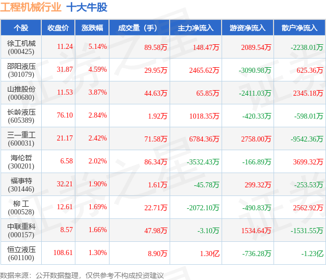 个股表现方面,工程机械行业当日领涨股为徐工机械(000425),该股当日报收11.24,上涨5.14%,成交量89.58万,主力资金净流入148.47万元。邵阳液压(301079)以上涨4.59%紧随其后,该股当日成交量29.95万,主力资金净流入2465.62万元。除此之外,山推股份(000680)、长龄液压(605389)、三一重工(600031)均进入当日牛股之列。具体个股列表见下表: