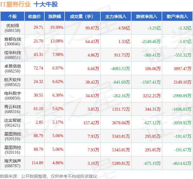 个股表现方面,IT服务行业当日领涨股为优刻得(688158),该股当日报收29.71,上涨19.99%,成交量99.87万,主力资金净流入4.58亿元。首都在线(300846)以上涨13.08%紧随其后,该股当日成交量64.43万,主力资金净流入1.33亿元。除此之外,佳华科技(688051)、卓易信息(688258)、航天软件(688562)均进入当日牛股之列。具体个股列表见下表: