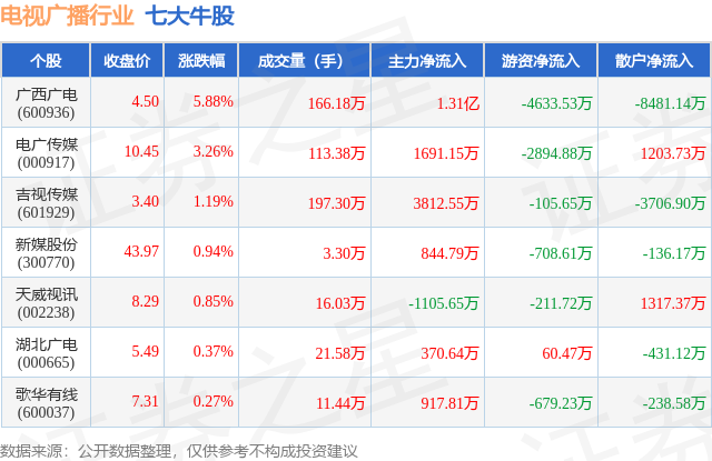 个股表现方面,电视广播行业当日领涨股为广西广电(600936),该股当日报收4.5,上涨5.88%,成交量166.18万,主力资金净流入1.31亿元。电广传媒(000917)以上涨3.26%紧随其后,该股当日成交量113.38万,主力资金净流入1691.15万元。除此之外,吉视传媒(601929)、新媒股份(300770)、天威视讯(002238)均进入当日牛股之列。具体个股列表见下表: