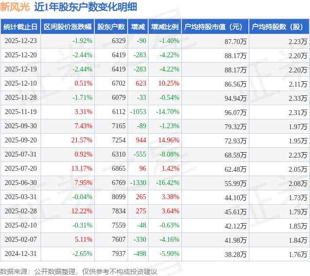 从股价来看,2025年12月20日至2025年12月23日,新风光区间跌幅为1.92%,在此期间股东户数减少90.0户,减幅为1.4%。