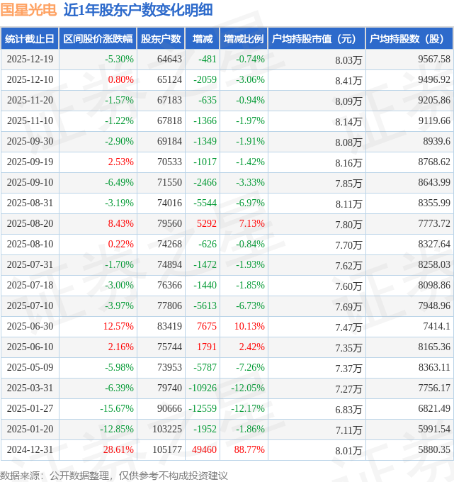 从股价来看,2025年12月10日至2025年12月19日,国星光电区间跌幅为5.3%,在此期间股东户数减少481.0户,减幅为0.74%。