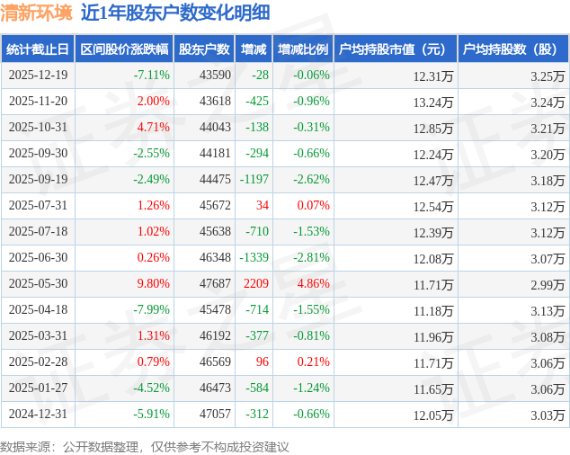 从股价来看,2025年11月20日至2025年12月19日,清新环境区间跌幅为7.11%,在此期间股东户数减少28.0户,减幅为0.06%。