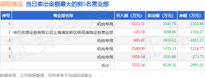 证券之星消息,沪深交易所2025年12月26日公布的交易公开信息显示,邵阳液压(301079)因日换手率达到30%的前5只证券登上龙虎榜。此次是近5个交易日内第1次上榜。