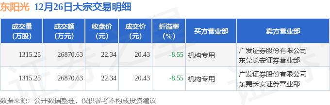证券之星消息,12月26日东阳光发生大宗交易,交易数据如下: