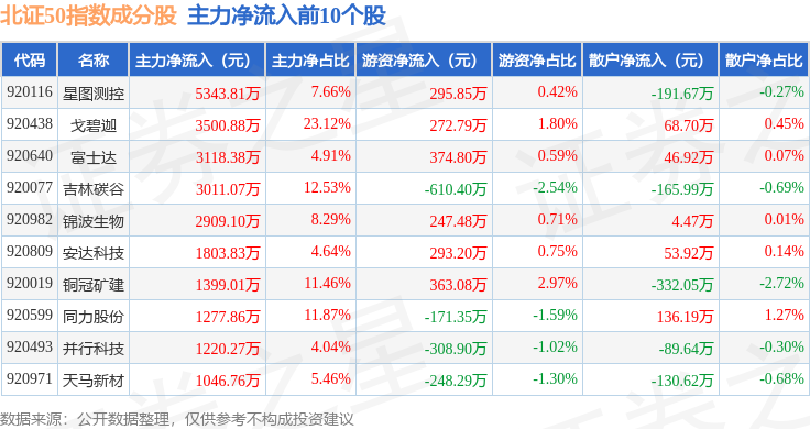 资金流向方面,北证50(899050)指数成份股当日主力资金净流入合计4766.4万元,游资资金净流出合计1.37亿元,散户资金净流出合计3951.91万元。成份股资金流向详情见下表: