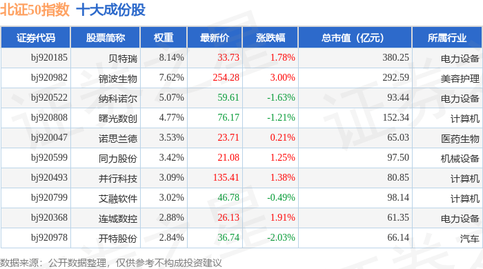 证券之星消息,12月26日,北证50(899050)指数报收于1463.04点,涨0.35%,成交210.73亿元,换手率3.72%。当日该指数成份股中,上涨的有19家,星图测控以5.06%的涨幅领涨,下跌的有31家,天力复合以7.21%的跌幅领跌。