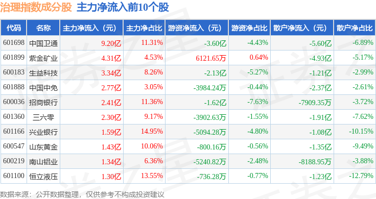 资金流向方面,治理指数(000019)成份股当日主力资金净流出合计17.28亿元,游资资金净流入合计5155.24万元,散户资金净流入合计16.77亿元。成份股资金流向详情见下表: