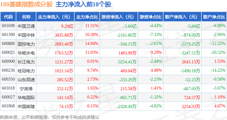 资金流向方面,180基建(000025)指数成份股当日主力资金净流出合计610.54万元,游资资金净流出合计7790.42万元,散户资金净流入合计8400.97万元。成份股资金流向详情见下表: