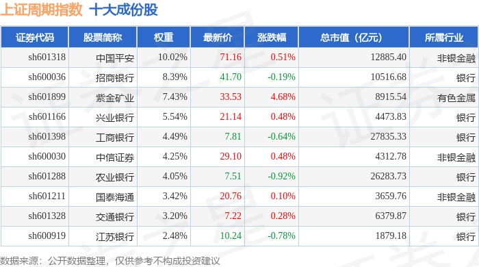 上证周期(000063)指数十大成份股详情如下: