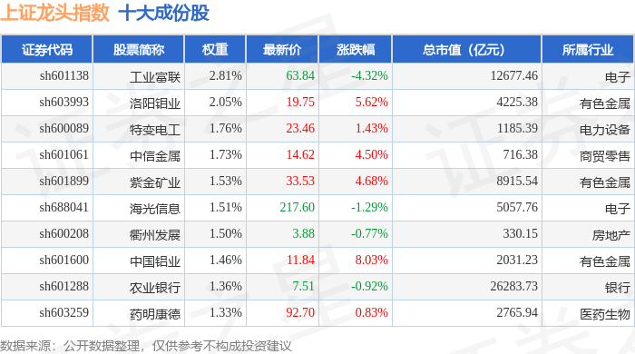 证券之星消息,12月26日,上证龙头(000065)指数报收于3616.64点,涨0.3%,成交1442.03亿元,换手率0.37%。当日该指数成份股中,上涨的有41家,中国中免以8.32%的涨幅领涨,下跌的有47家,工业富联以4.32%的跌幅领跌。