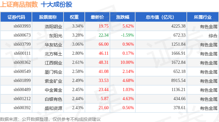 证券之星消息,12月26日,上证商品(000066)指数报收于3499.62点,涨1.72%,成交674.81亿元,换手率0.77%。当日该指数成份股中,上涨的有41家,江西铜业以10.0%的涨幅领涨,下跌的有8家,华鲁恒升以2.44%的跌幅领跌。