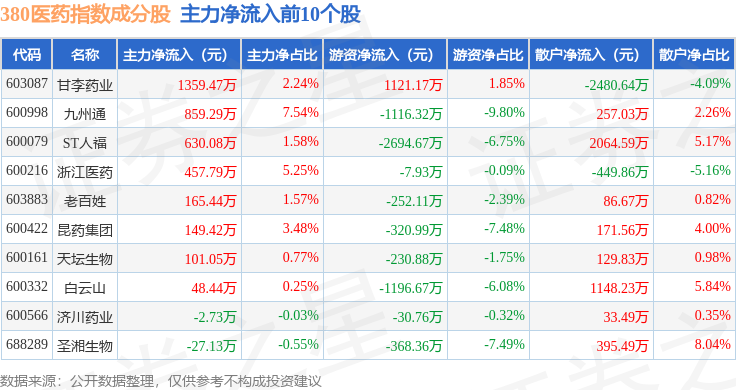 资金流向方面,380医药(000109)指数成份股当日主力资金净流出合计3.61亿元,游资资金净流出合计2049.3万元,散户资金净流入合计3.82亿元。成份股资金流向详情见下表: