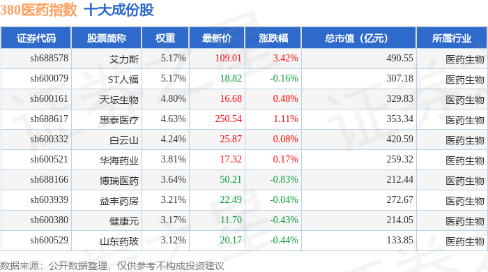 证券之星消息,12月26日,380医药(000109)指数报收于10093.24点,涨0.05%,成交64.37亿元,换手率0.7%。当日该指数成份股中,上涨的有14家,艾力斯以3.42%的涨幅领涨,下跌的有27家,皓元医药以3.0%的跌幅领跌。