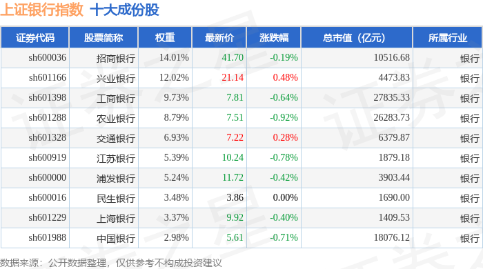 证券之星消息,12月26日,上证银行(000134)指数报收于1028.22点,跌0.34%,成交146.91亿元,换手率0.14%。当日该指数成份股中,上涨的有4家,兴业银行以0.48%的涨幅领涨,下跌的有21家,渝农商行以1.25%的跌幅领跌。