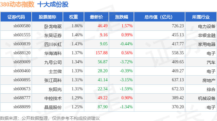 证券之星消息,12月26日,380动态(000141)指数报收于3916.57点,涨0.71%,成交1662.17亿元,换手率2.61%。当日该指数成份股中,上涨的有101家,中复神鹰以12.56%的涨幅领涨,下跌的有83家,燕东微以4.73%的跌幅领跌。