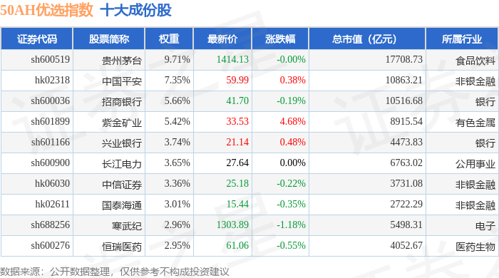 证券之星消息,12月26日,50AH优选(000170)指数报收于6212.5点,涨0.25%,成交570.06亿元,换手率0.5%。当日该指数成份股中,上涨的有15家,紫金矿业以4.68%的涨幅领涨,下跌的有30家,中国中免以2.94%的跌幅领跌。