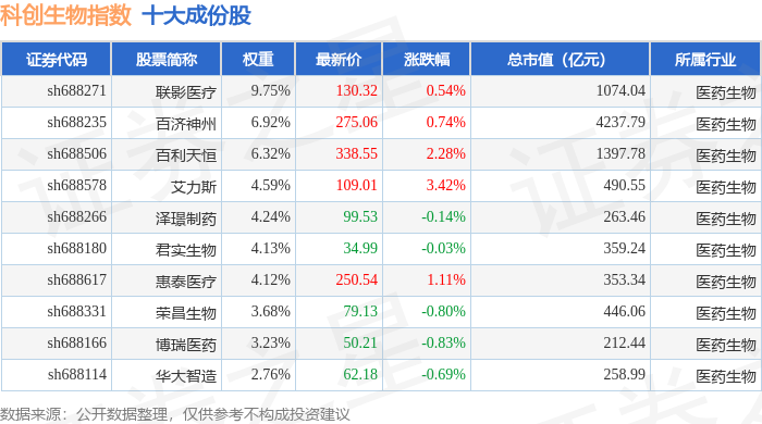 证券之星消息,12月26日,科创生物(000683)指数报收于1099.48点,涨0.1%,成交69.75亿元,换手率0.82%。当日该指数成份股中,上涨的有13家,艾力斯以3.42%的涨幅领涨,下跌的有37家,翔宇医疗以3.79%的跌幅领跌。