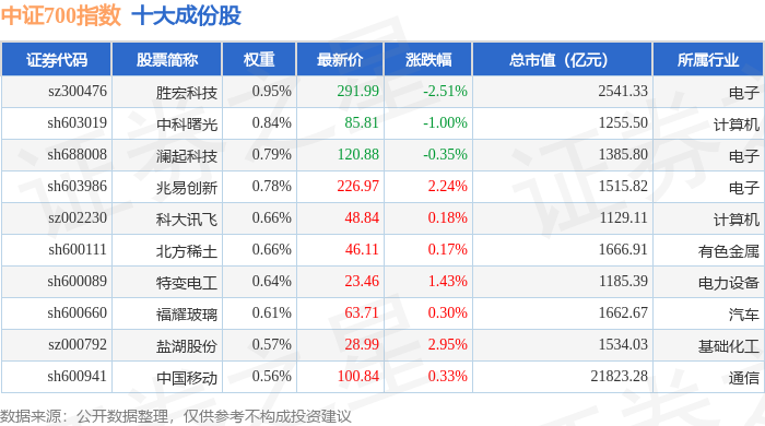 证券之星消息,12月26日,中证700(000907)指数报收于6477.03点,涨0.6%,成交6243.57亿元,换手率1.5%。当日该指数成份股中,上涨的有359家,中复神鹰以12.56%的涨幅领涨,下跌的有305家,英科医疗以6.72%的跌幅领跌。