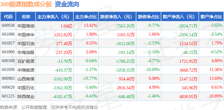 资金流向方面,300能源(000908)指数成份股当日主力资金净流入合计1384.71万元,游资资金净流出合计1.01亿元,散户资金净流入合计8722.62万元。成份股资金流向详情见下表: