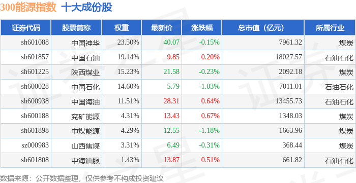 证券之星消息,12月26日,300能源(000908)指数报收于2297.0点,跌0.13%,成交40.65亿元,换手率0.1%。当日该指数成份股中,上涨的有4家,兖矿能源以0.67%的涨幅领涨,下跌的有5家,中煤能源以1.18%的跌幅领跌。