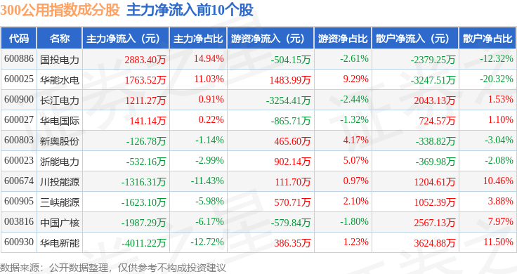 资金流向方面,300公用(000917)指数成份股当日主力资金净流出合计3.88亿元,游资资金净流入合计1.39亿元,散户资金净流入合计2.49亿元。成份股资金流向详情见下表: