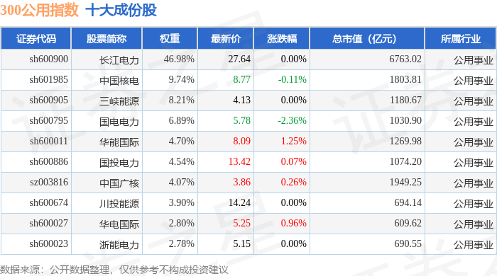 300公用(000917)指数十大成份股详情如下: