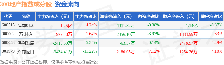 资金流向方面,300地产(000952)指数成份股当日主力资金净流入合计7609.42万元,游资资金净流出合计1350.74万元,散户资金净流出合计6258.68万元。成份股资金流向详情见下表:
