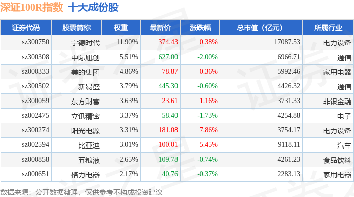 证券之星消息,12月26日,深证100R(399004)指数报收于8360.08点,涨0.25%,成交2036.0亿元,换手率1.01%。当日该指数成份股中,上涨的有40家,阳光电源以7.86%的涨幅领涨,下跌的有57家,新诺威以6.77%的跌幅领跌。