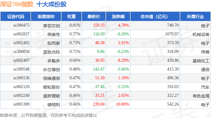证券之星消息,12月26日,深证700(399010)指数报收于8856.6点,涨0.34%,成交4106.34亿元,换手率3.39%。当日该指数成份股中,上涨的有281家,宏源药业以20.0%的涨幅领涨,下跌的有392家,天铁科技以13.43%的跌幅领跌。