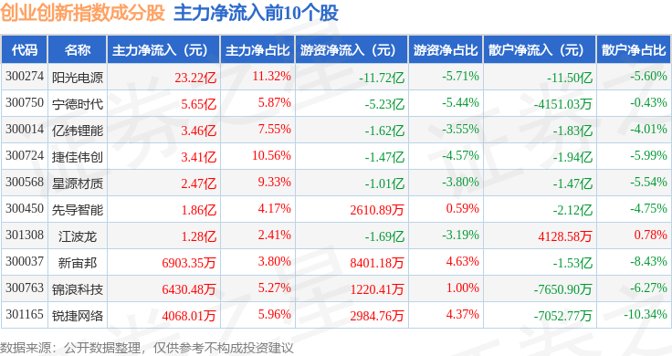 资金流向方面,创业创新(399018)指数成份股当日主力资金净流出合计9.67亿元,游资资金净流出合计3.92亿元,散户资金净流入合计13.6亿元。成份股资金流向详情见下表: