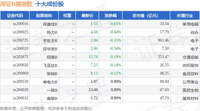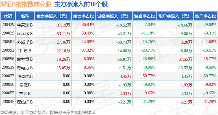 资金流向方面,深证B指(399108)指数成份股当日主力资金净流入合计38.37万元,游资资金净流入合计11.72万元,散户资金净流出合计50.08万元。成份股资金流向详情见下表:
