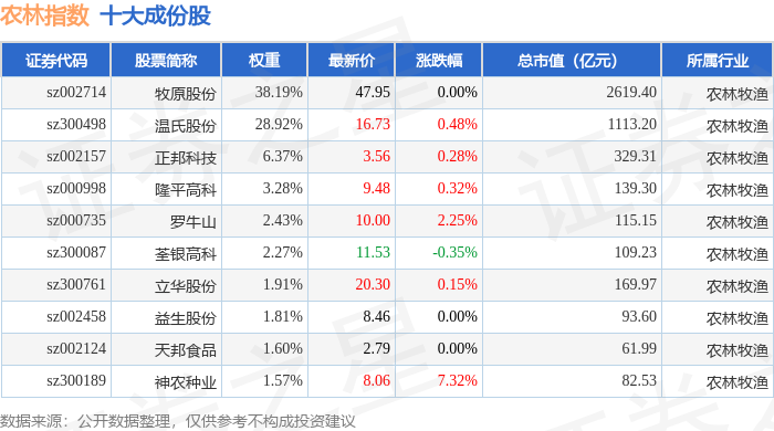 农林指数(399231)十大成份股详情如下: