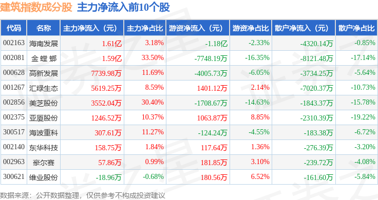 资金流向方面,建筑指数(399235)成份股当日主力资金净流入合计1.56亿元,游资资金净流出合计1.34亿元,散户资金净流出合计2152.08万元。成份股资金流向详情见下表: