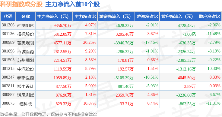 资金流向方面,科研指数(399243)成份股当日主力资金净流入合计1.14亿元,游资资金净流出合计1.38亿元,散户资金净流入合计2405.74万元。成份股资金流向详情见下表:
