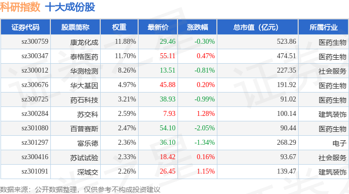 科研指数(399243)十大成份股详情如下: