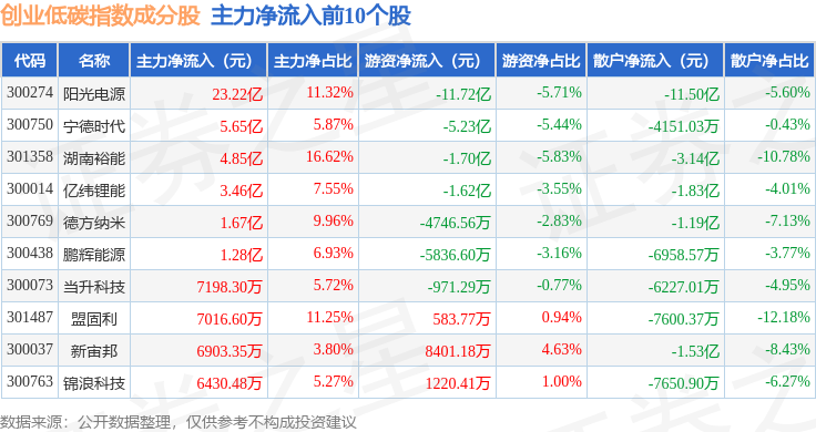 资金流向方面,创业低碳(399259)指数成份股当日主力资金净流入合计30.35亿元,游资资金净流出合计16.73亿元,散户资金净流出合计13.62亿元。成份股资金流向详情见下表:
