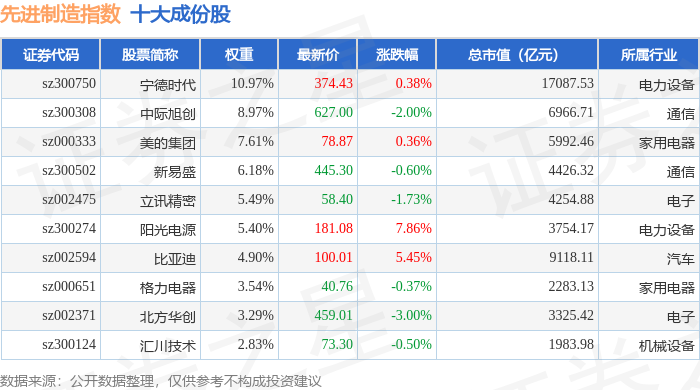 证券之星消息,12月26日,先进制造(399260)指数报收于3850.72点,涨0.22%,成交1618.31亿元,换手率1.31%。当日该指数成份股中,上涨的有21家,阳光电源以7.86%的涨幅领涨,下跌的有29家,北方华创以3.0%的跌幅领跌。