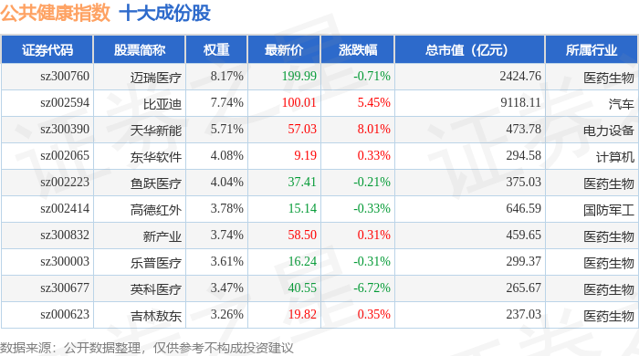 公共健康(399277)指数十大成份股详情如下: