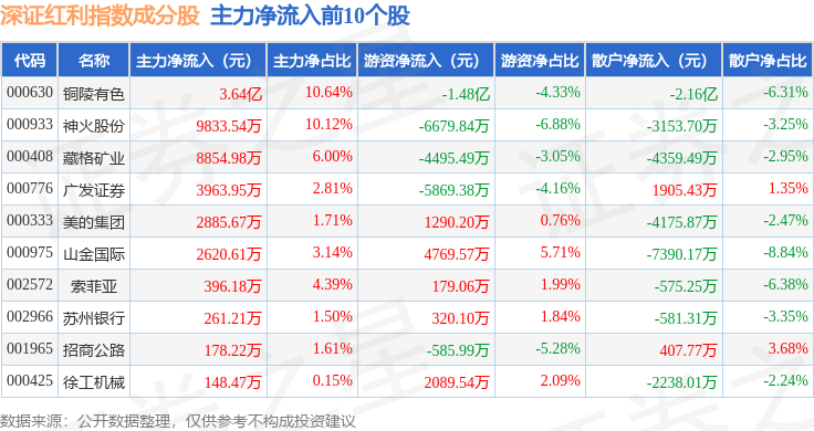 资金流向方面,深证红利(399324)指数成份股当日主力资金净流出合计6.4亿元,游资资金净流入合计1.81亿元,散户资金净流入合计4.6亿元。成份股资金流向详情见下表: