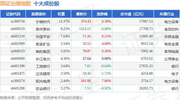 证券之星消息,12月26日,国证治理(399322)指数报收于10566.53点,涨0.51%,成交1278.86亿元,换手率0.27%。当日该指数成份股中,上涨的有21家,中国铝业以8.03%的涨幅领涨,下跌的有28家,工业富联以4.32%的跌幅领跌。