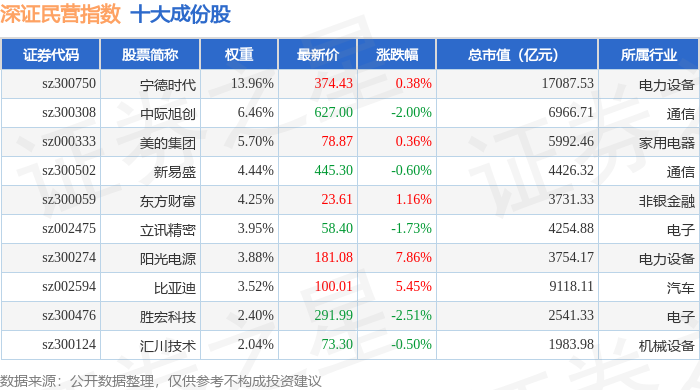 深证民营(399337)指数十大成份股详情如下: