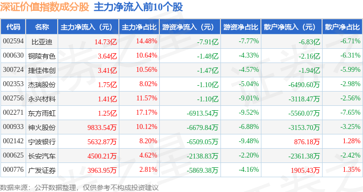资金流向方面,深证价值(399348)指数成份股当日主力资金净流出合计5.3亿元,游资资金净流出合计9.12亿元,散户资金净流入合计14.42亿元。成份股资金流向详情见下表: