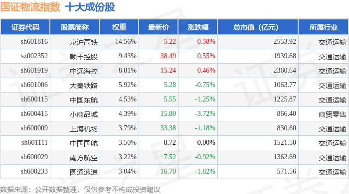 证券之星消息,12月26日,国证物流(399353)指数报收于2150.87点,跌0.11%,成交161.76亿元,换手率0.82%。当日该指数成份股中,上涨的有11家,海航控股以2.27%的涨幅领涨,下跌的有26家,小商品城以3.72%的跌幅领跌。